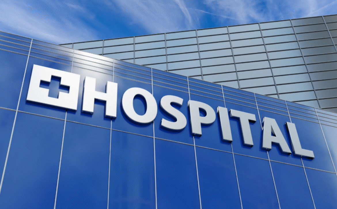 Building facade of a hospital in commercial and business district under blue sky